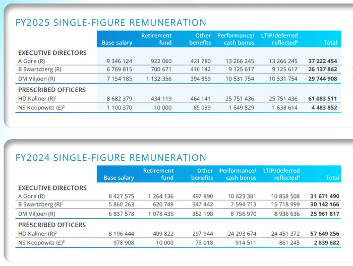 This is according to the group’s latest remuneration report, which revealed that Kallner’s package includes a base salary of R8.7 million alongside over R25 million in performance bonuses and long-term incentives.