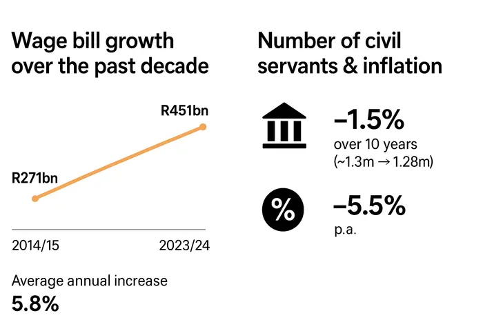 Despite this modest change in headcount, the wage bill has increased sharply, rising from R271 billion in 2014/15 to R451 billion in 2023/24 at an average annual increase of 5.8%.
