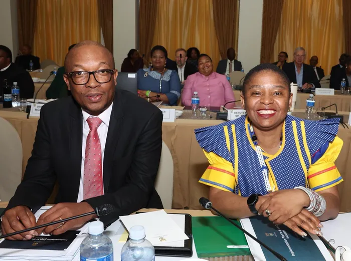 Trade, Industry and Competition Minister Parks Tau and Minister in the Presidency, Khumbudzo Ntshavheni, during the Cabinet Lekgotla at the Sefako Makgatho Presidential Guesthouse in Pretoria. on Tuesday.
