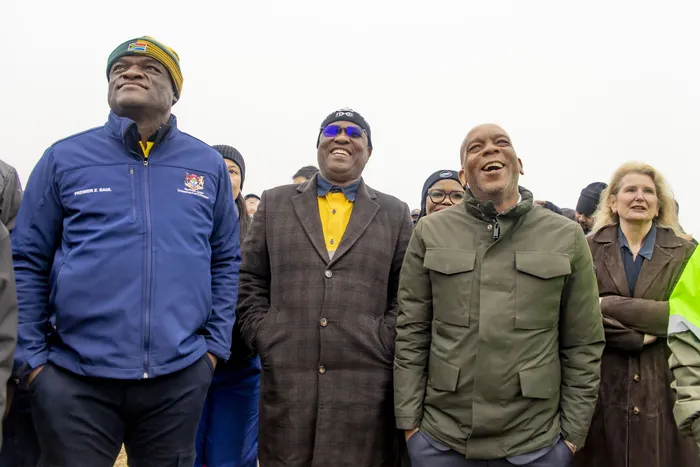 From left, Dr Zamani Saul, Premier of the Northern Cape, Oscar Mahuyane, Premier of the Eastern Cape, and Dr Ramokgopa, Minister of Electricity and Energy, at the inauguration of the R15 billion Envusa Energy Koruson Cluster renewable energy project.
