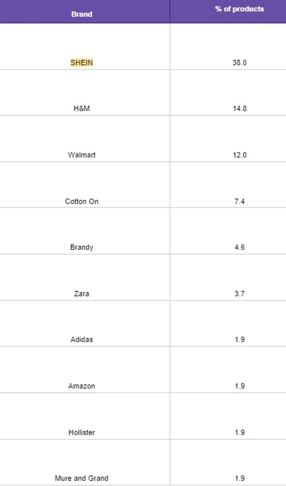 Boston-based online marketplace Temu was the third-most popular brand, attributing 7.7% of items featured.