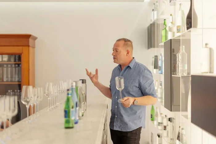 Founder of the Fine water company and water sommelier, Nico Pieterse, explains water properties and specialities during a water tasting session at Lanzerac in Stellenbosch on January 17, 2026.