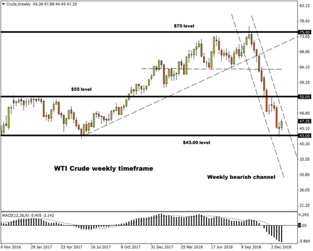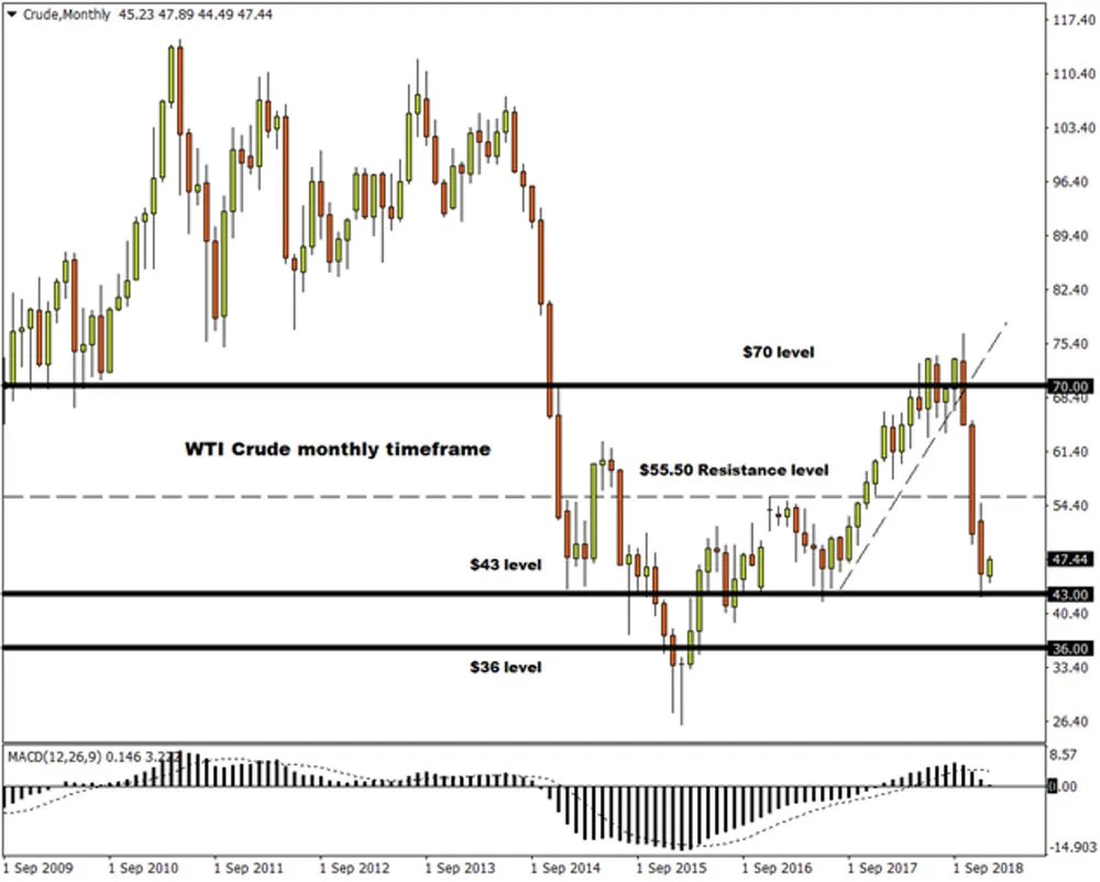 Taking a look at the technical picture, WTI Crude is unquestionably bearish on the weekly and monthly timeframes.