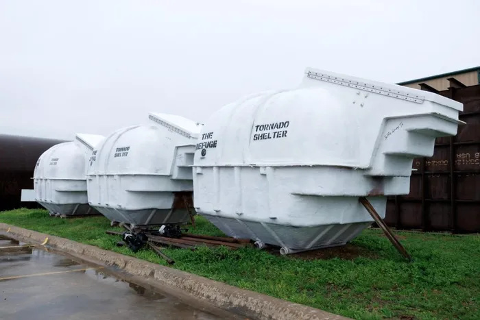 Tornado shelters are seen outside at the Atlas Survival Shelters factory in Sulphur Springs, Texas on March 7, 2026. Since the war in the Middle East began nearly two weeks ago, the phone at Ron Hubbard's bomb shelter company Atlas Survival Shelters in Texas hasn't stopped ringing. Foreign and US clients are rushing to buy his bunkers, seeking refuge in case of air raids, nuclear fallout or apocalypse.