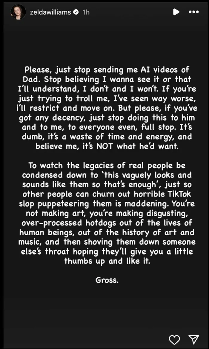 The proliferation of AI-generated videos of her father isn't just an irritation; it’s a violation of Robin’s memory and humanity.