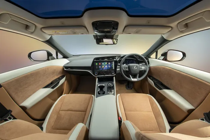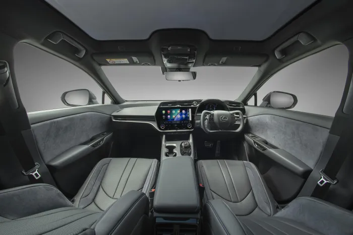 The RZ’s interior follows Lexus’ Tazuna cockpit layout, positioning controls and displays within the driver’s direct line of sight.