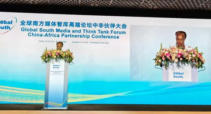 African Union Director of Information and Communication Leslie Richer speaks at the Global South Media Think Tank High-Level Forum and China-Africa Partnership Conference in Johannesburg.