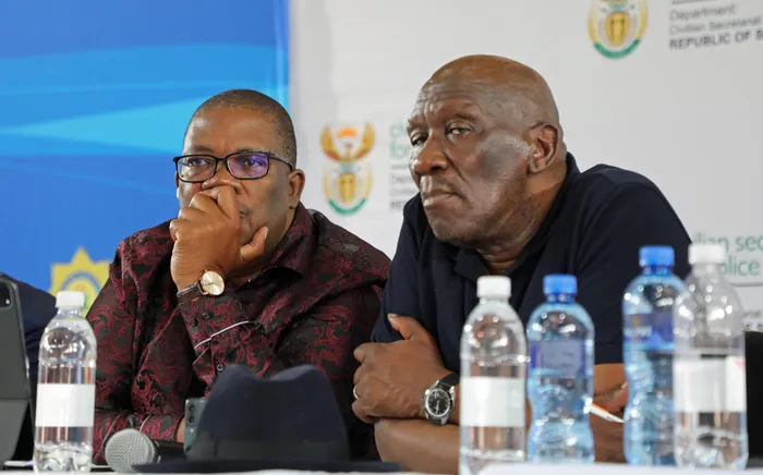 Two men sitting at a table Gauteng Premier Panyaza Lesufi with Police Minister Bheki Cele. File Picture: Timothy Bernard / Independent Newspapers