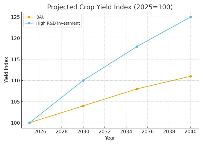 Projected Crop Yield Index (2025=100). Yields rise significantly under high R&D investment compared to business-as-usual