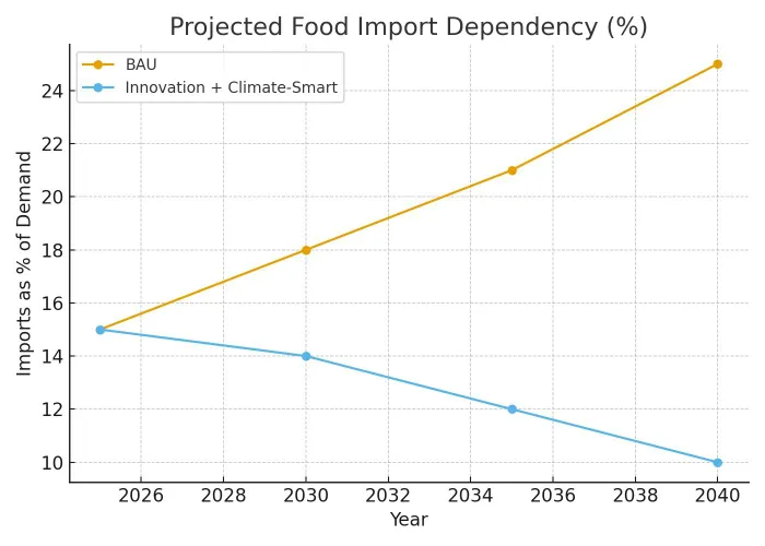 Yet innovation alone is not enough. If smallholder farmers are excluded from the innovation ecosystem, productivity gains will be uneven. IFs scenarios that combine technology diffusion with inclusive land reform and financial support mechanisms show the greatest overall benefits: higher rural incomes, expanded youth employment, and more stable food prices. It can be seen from Figure 2 that without innovation (BAU = Business as Usual), dependency rises. With climate-smart practices and inclusive innovation, imports decline.