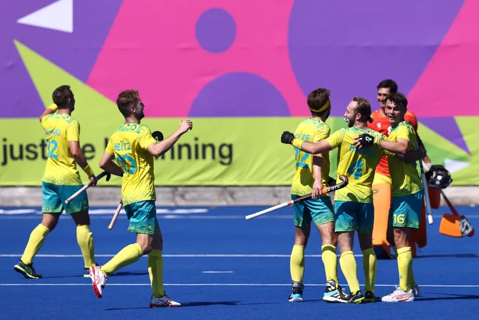 Australia's players celebrate their win at the end of their men's gold medal hockey match against India on day 11 of the Commonwealth Games at the University of Birmingham Hockey and Squash Centre in Birmingham, central England, on Monday Australia's players celebrate their win at the end of their men's gold medal hockey match against India on day 11 of the Commonwealth Games at the University of Birmingham Hockey and Squash Centre in Birmingham, central England, on Monday. Photo: Darren Staples/AFP